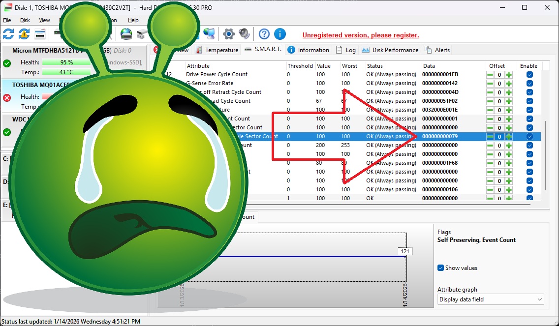 Yep. The user experience “design” pros who built this app know their tech, but they obviously have never met a user. Because the key piece of info on this line is presented by default in hexadecimal, which may be the lingua franca for programmers and savants, but is gibberish to normal users. The real number of bad sectors is… 121, which is what 00000000000000000079 means in normal base-10 notation, which you and I call “numbers.” When I found this out I had to laugh at the sheer audacity. Literally decades of hard work developing and maintaining this product (since 2005) and they have never thought to put this info in NUMBERS.