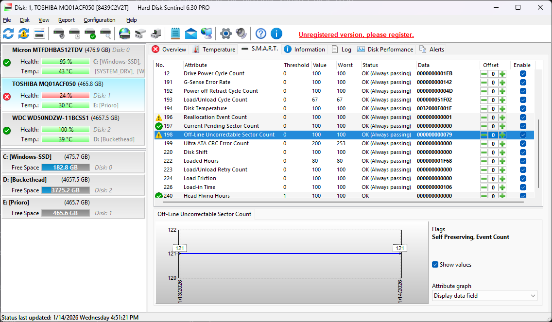 In this case, I’m most interested in the “off-line uncorrectable sector count,” aka spots where the drive is physically unreadable. Here, the app is showing me that data. Kinda. Can you find the count of bad sectors?